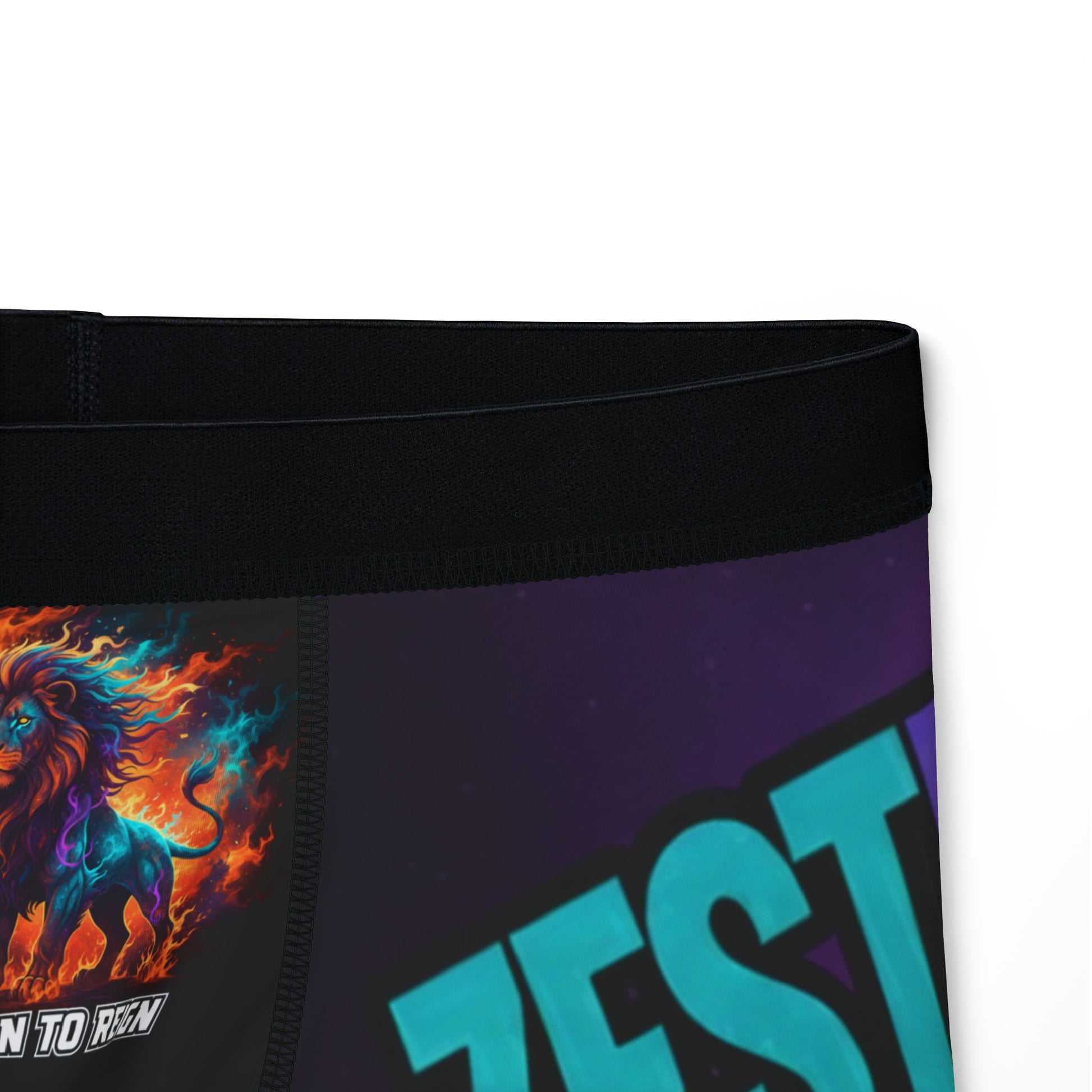 Born to Reign. Premium cosmic Leo boxer briefs featuring powerful royal energy with bold teal, purple, and orange nebula flames. Perfect for the confident fire sign who commands respect and leads with natural authority.