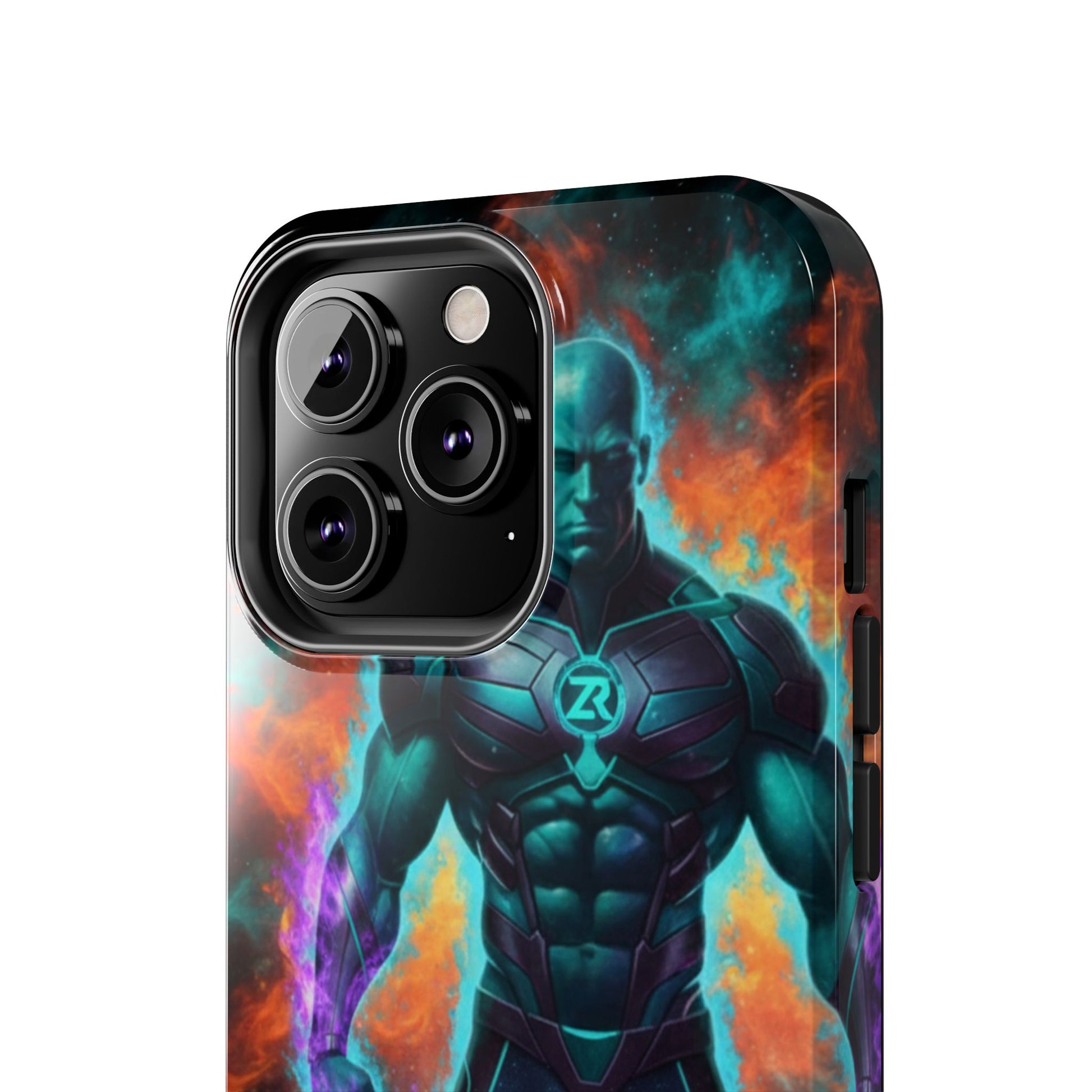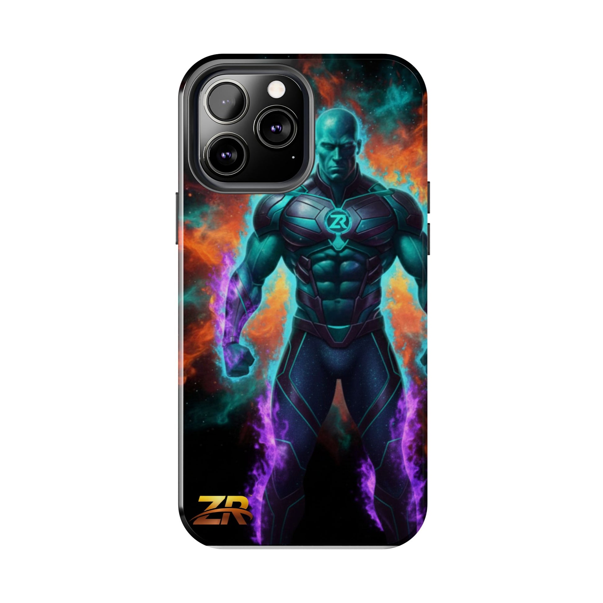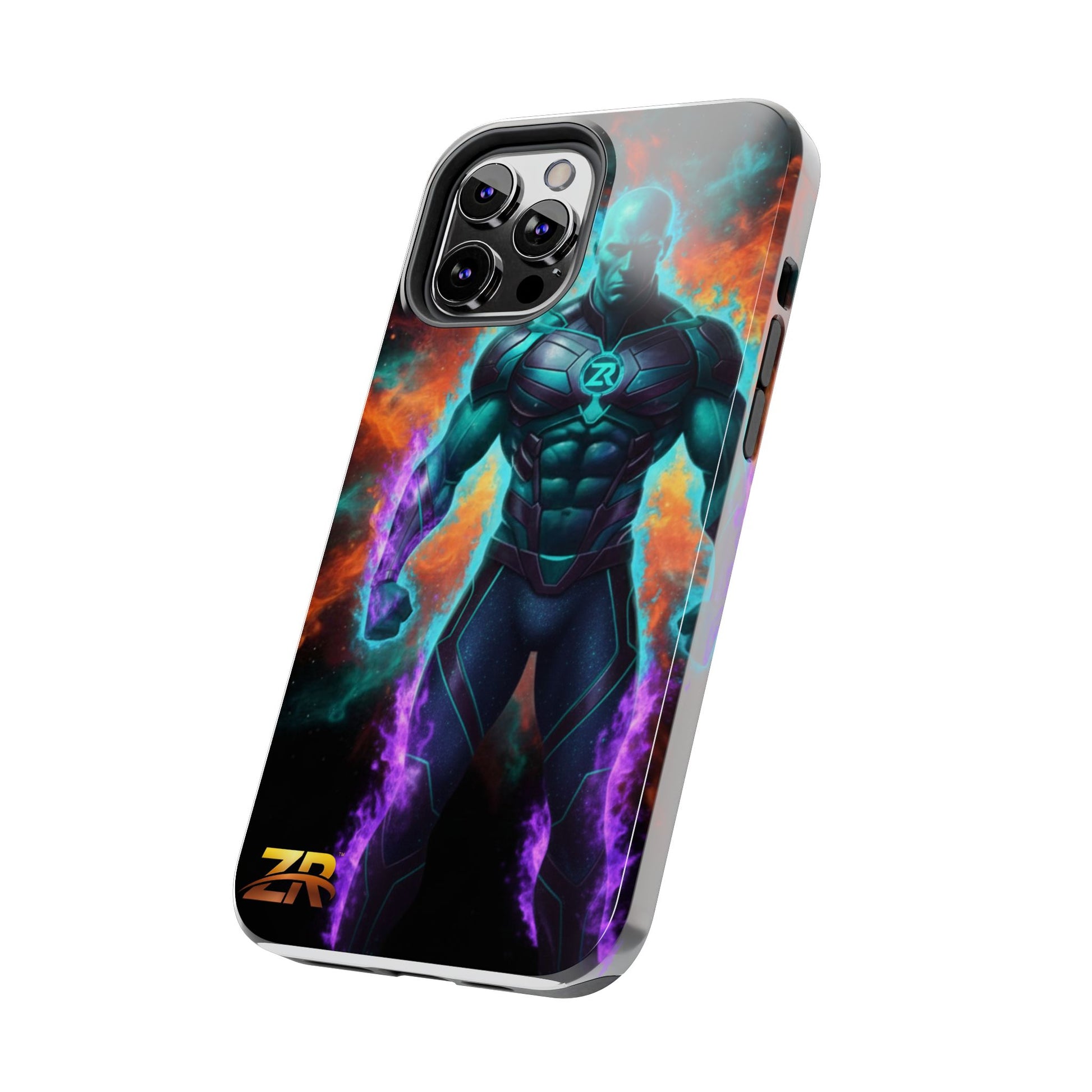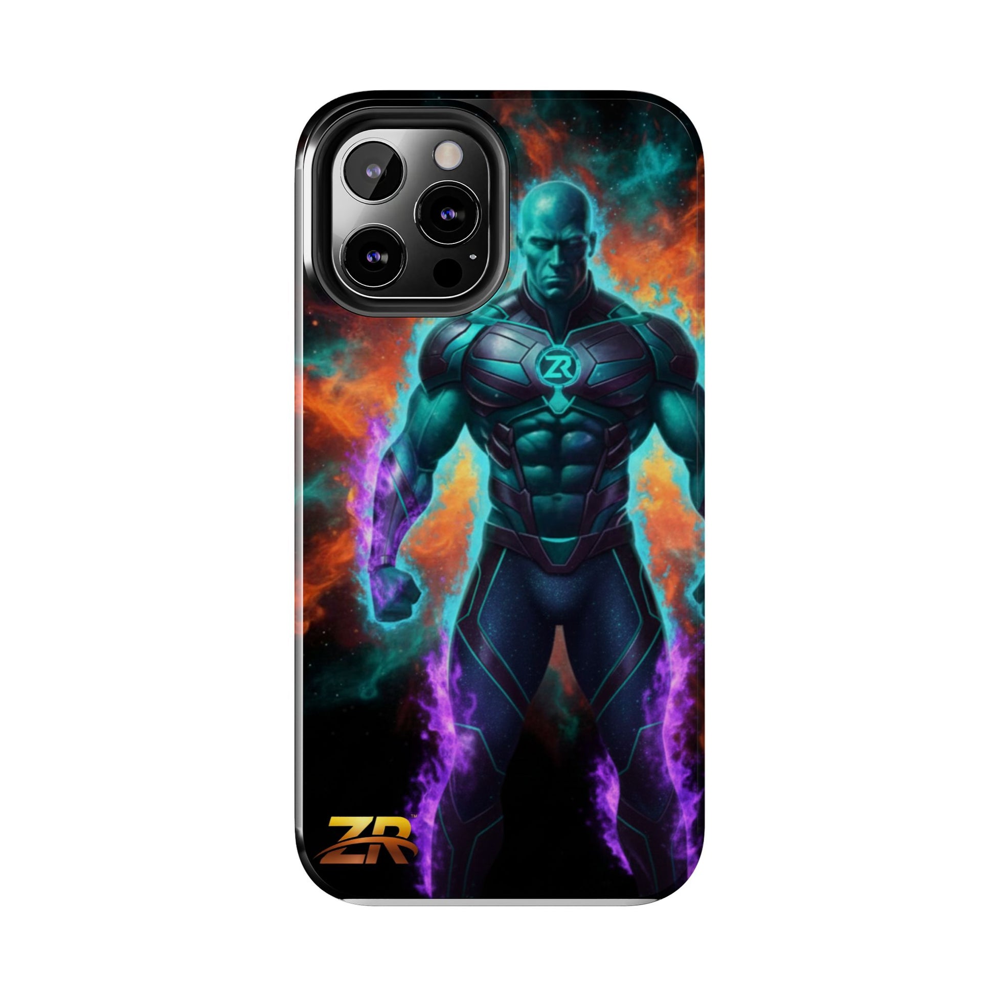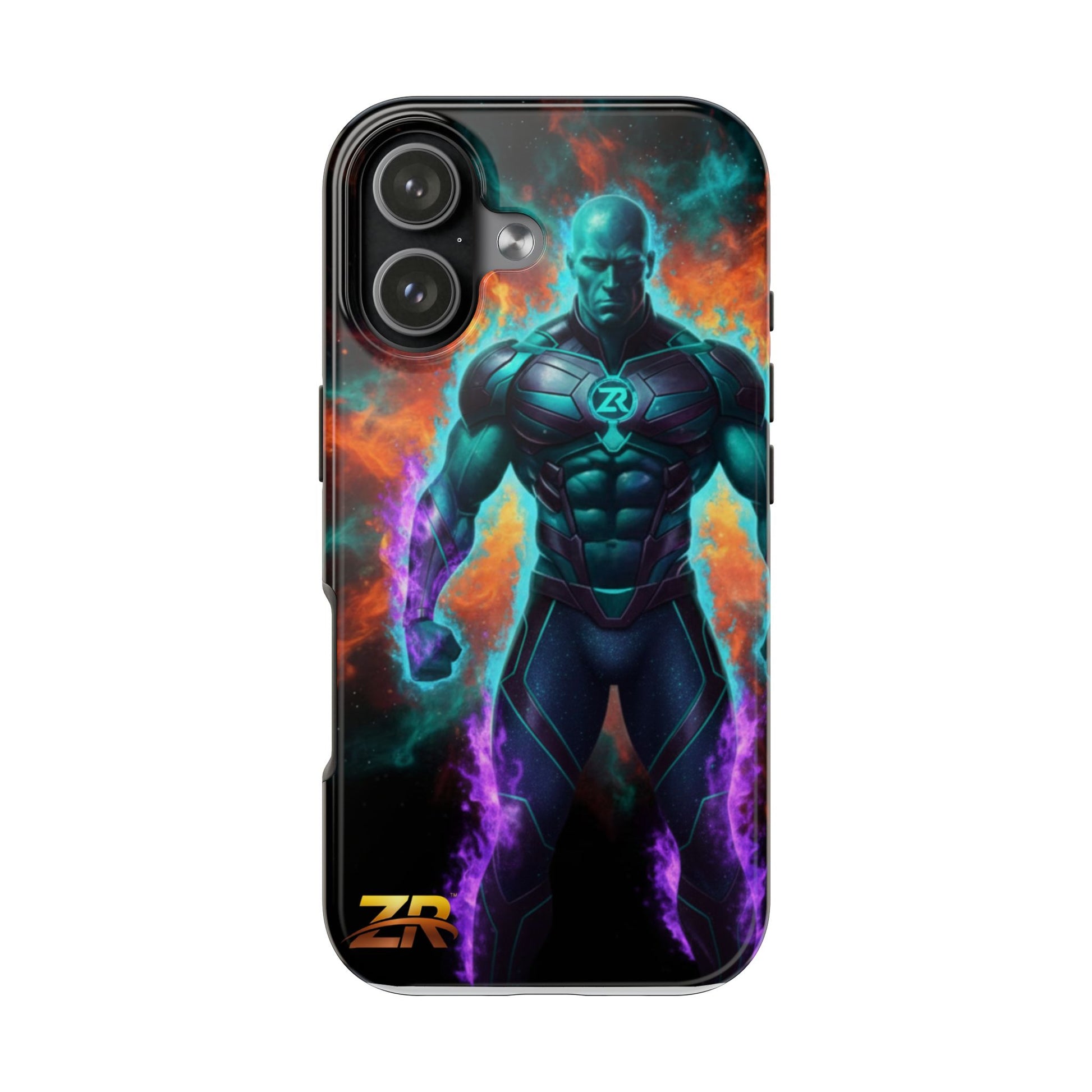 Protect your phone with cosmic power. The COSMIC SUPERHERO Phone Case from BLOODLINE™ GUARDIANS Collection features a powerful teal-skinned warrior with muscular build, ZR™ logo chest armor, and purple energy flames. Epic cosmic background with orange and teal nebula clouds. Premium dual-layer protection with glossy finish and shock-absorbent design. Available for iPhone and Samsung Galaxy models. Limited edition premium phone protection by Zest Rhythm™. It's Not Just Gear — It's A BLOODLINE™. It's Only The Start 🚀