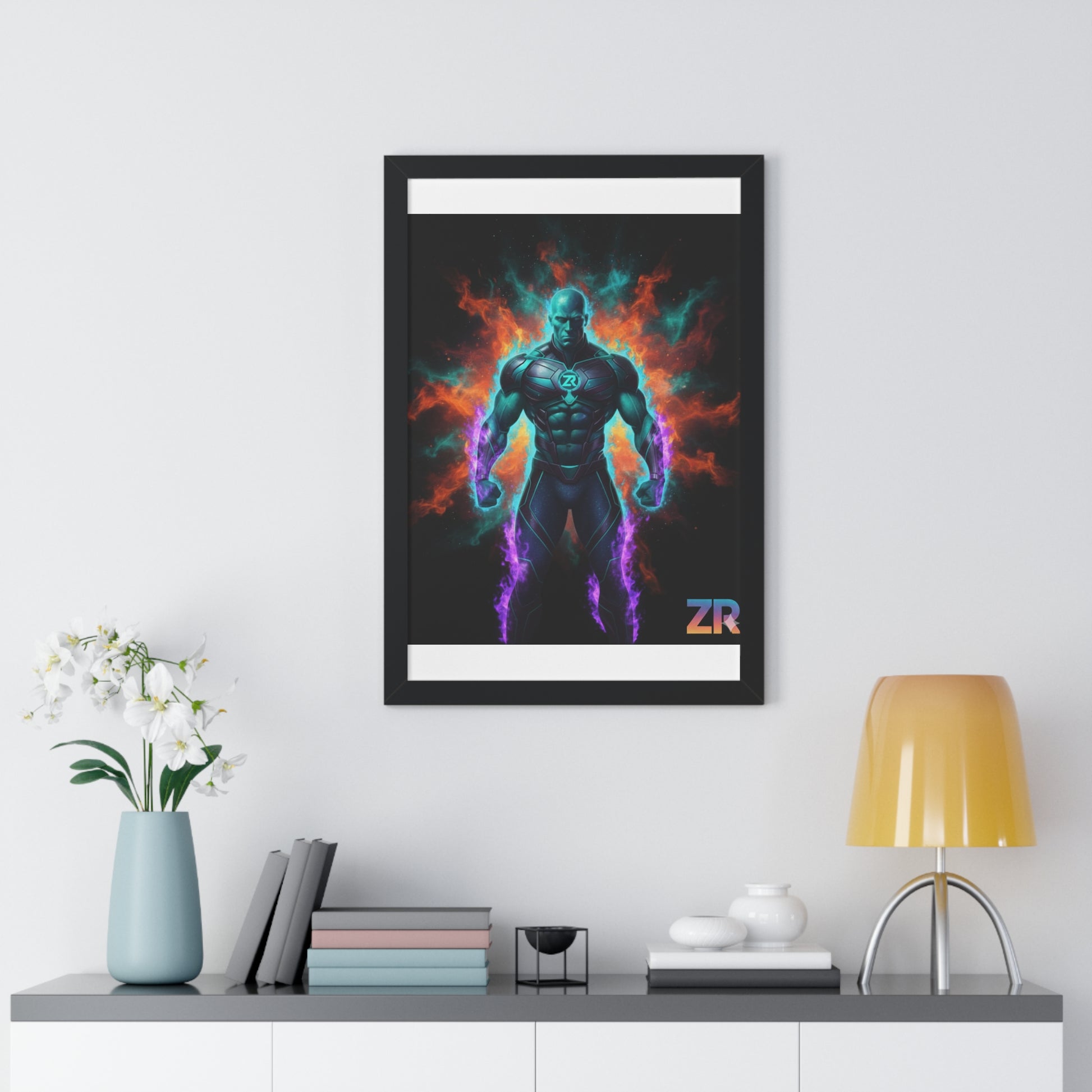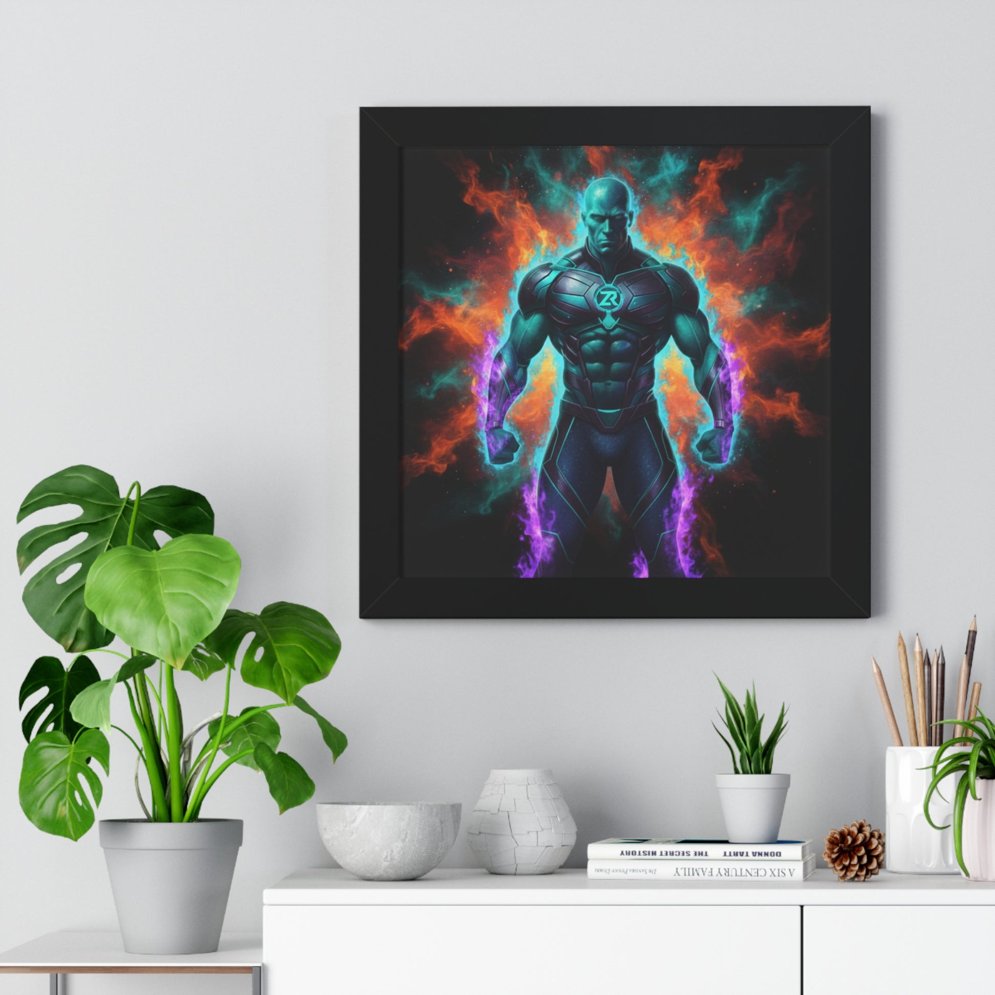 Premium BOSS MAN Cosmic Warrior wall art from BLOODLINE™ Power Collection. Caribbean-teal cosmic superhero with glowing ZR™ armor and purple cosmic flames. Museum-quality framed poster featuring ultimate power stance with black matte border. Limited edition dark-fantasy cosmic design with full body armor and energy aura. Intense drill instructor energy meets cosmic mythology. Gallery-worthy presentation with dramatic lighting effect. Perfect for home, office, or studio. It's Not Just Gear — It's A BLOODLINE™. It's Only The Start 🚀