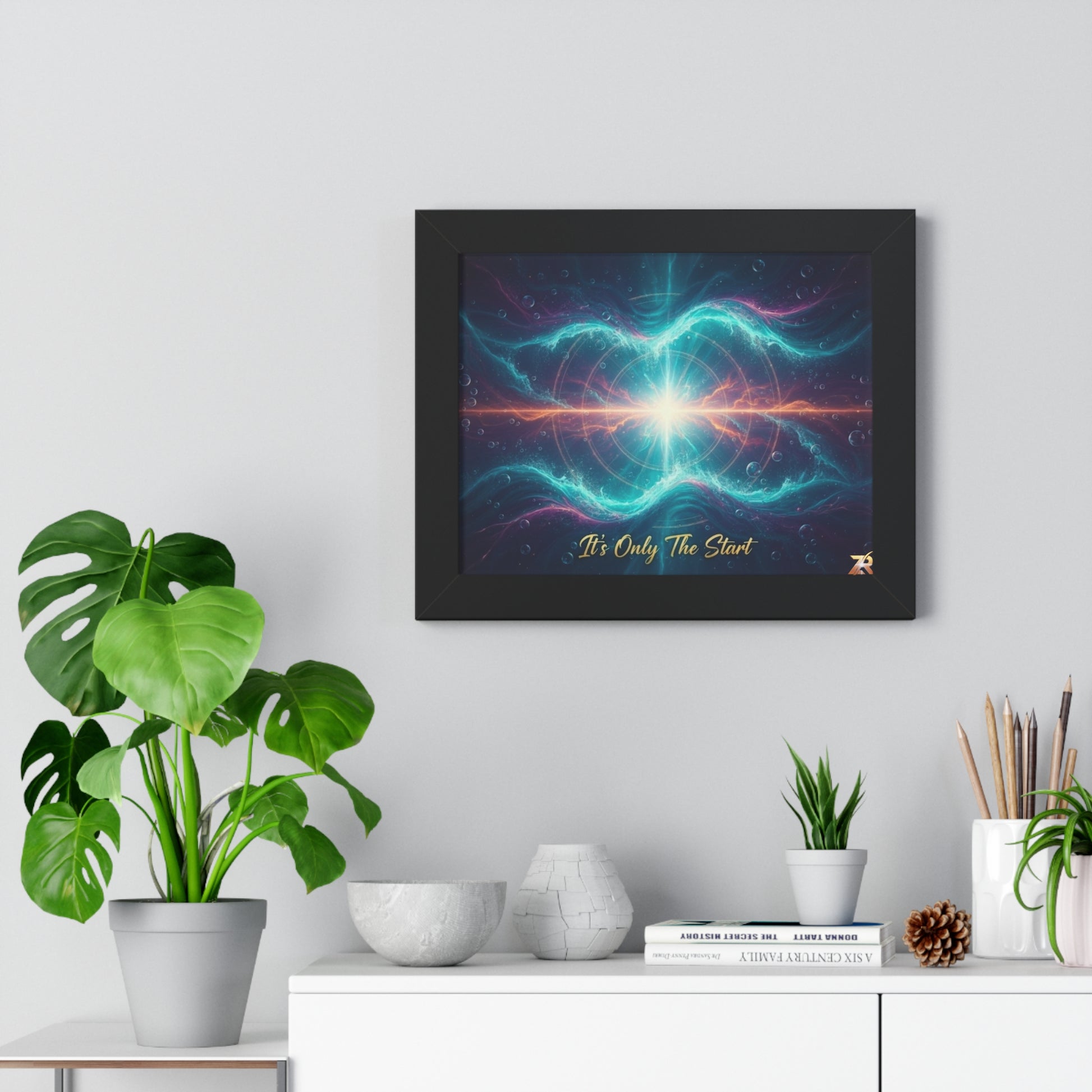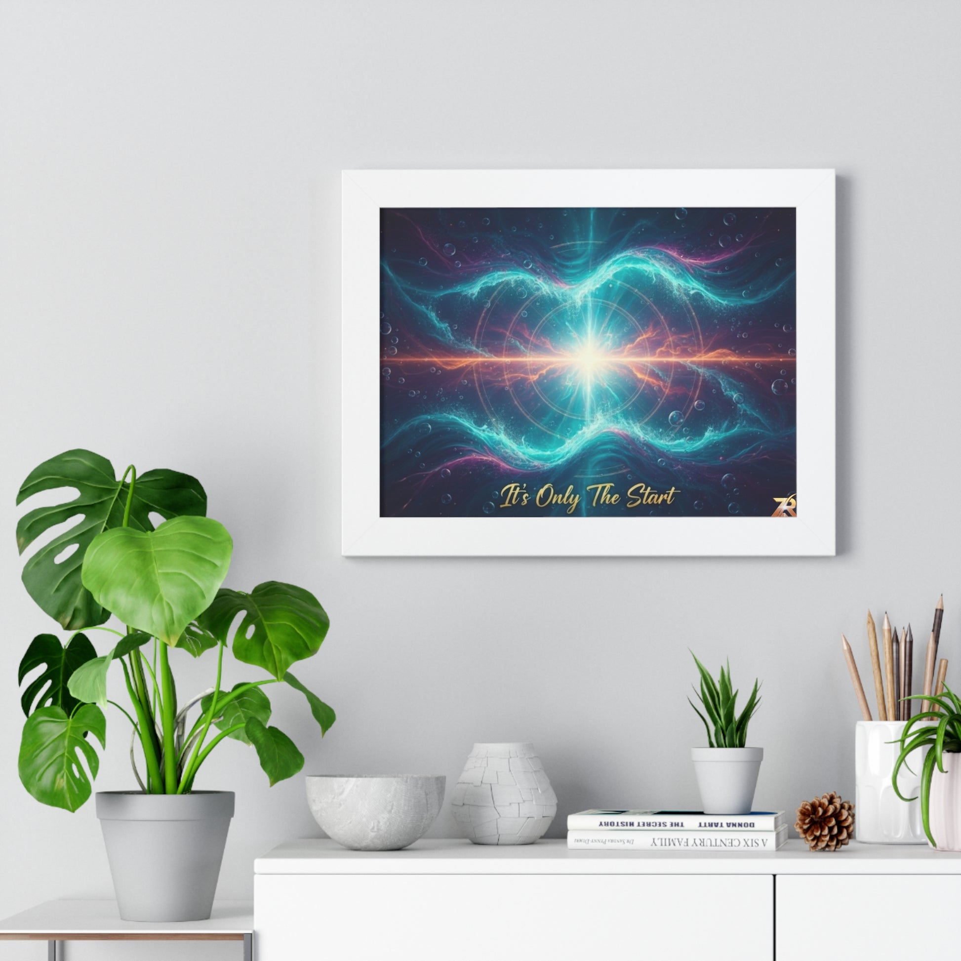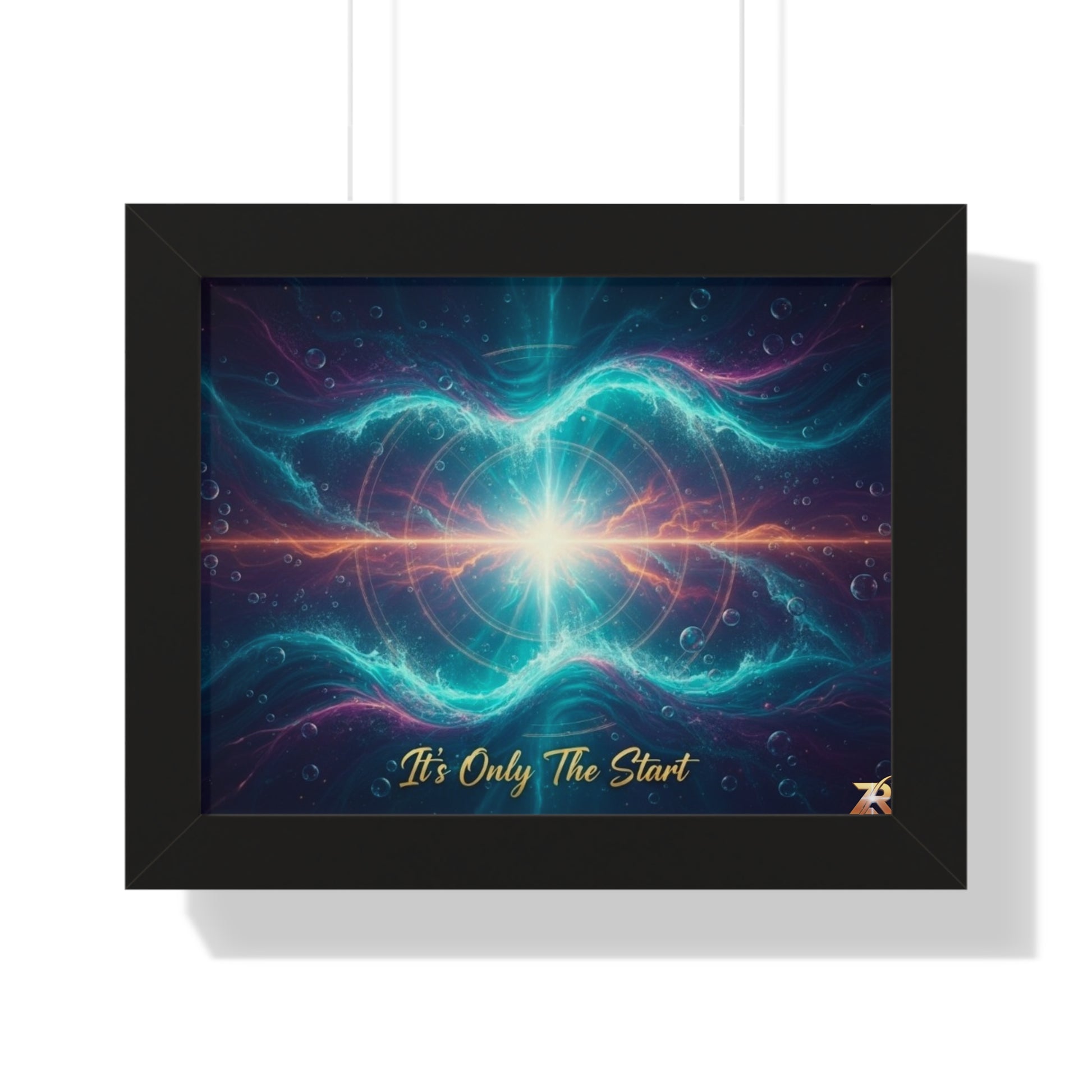 Step into the infinite with this mesmerizing Cosmic Portal wall art from the BLOODLINE™ Gallery Collection. A stunning cosmic nebula design featuring vibrant teal energy rings, purple crystalline formations, and the signature "It's Only The Start" tagline with gold ZR™ logo.