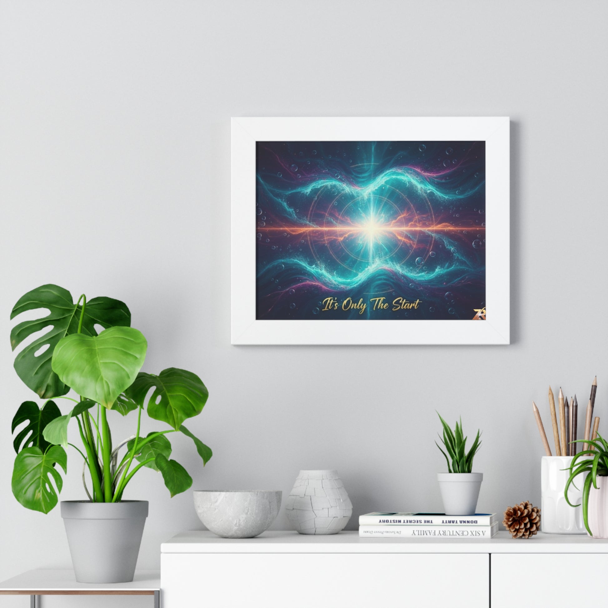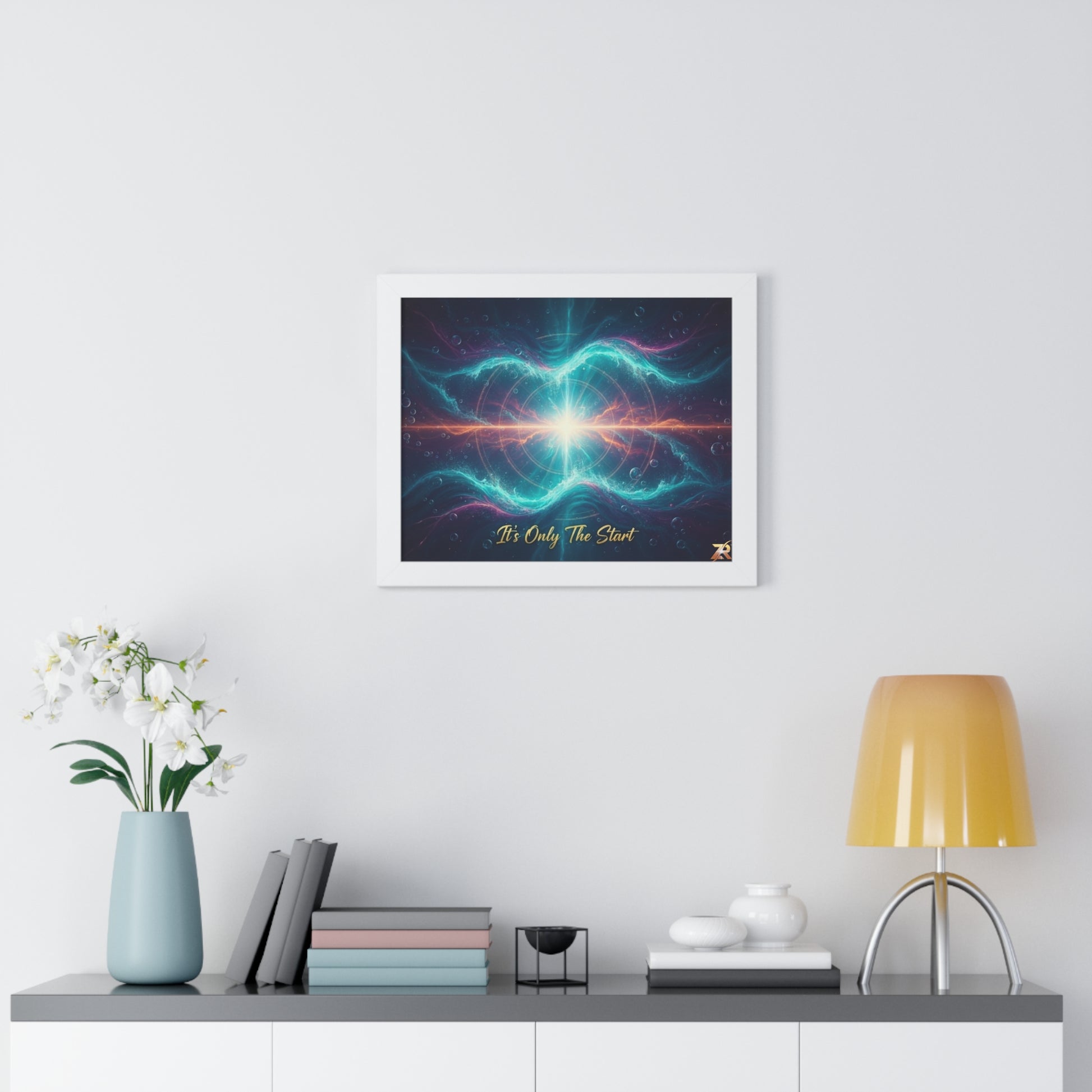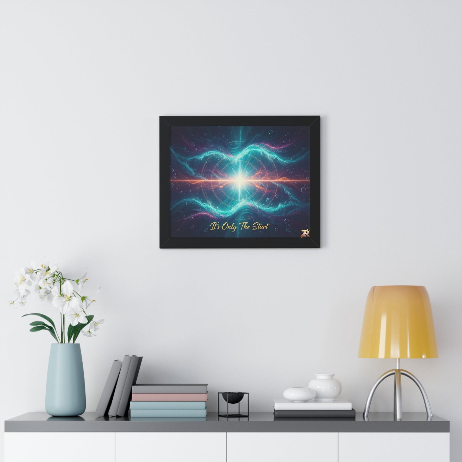 Step into the infinite with this mesmerizing Cosmic Portal wall art from the BLOODLINE™ Gallery Collection. A stunning cosmic nebula design featuring vibrant teal energy rings, purple crystalline formations, and the signature "It's Only The Start" tagline with gold ZR™ logo.