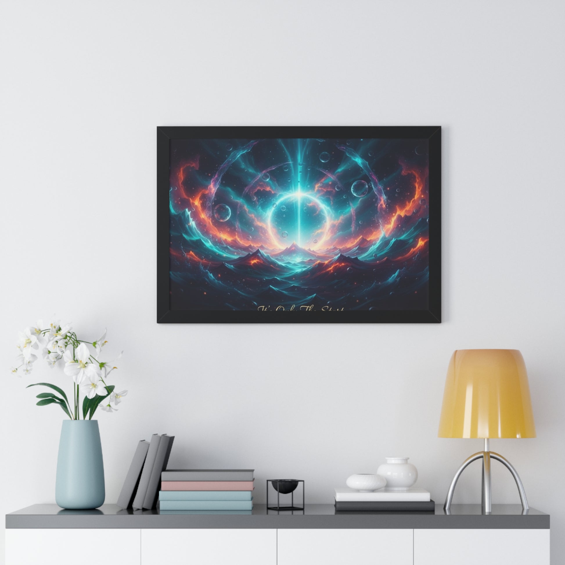 A framed horizontal poster that brings a cinematic, otherworldly scene into any room. Vivid pigment inks render turquoise lights, ember-orange clouds, and deep inky shadows with crisp contrast on museum-grade, matte LexJet paper. The artwork floats within a clean MDF frame (black, walnut, or white) behind a protective acrylic cover. Pre-installed hanging hardware and a fixed hanging kit make it simple to display the piece right out of the box. This poster feels like a quiet doorway to the unknown — a nightly invitation to sit, stare, and imagine what comes next.